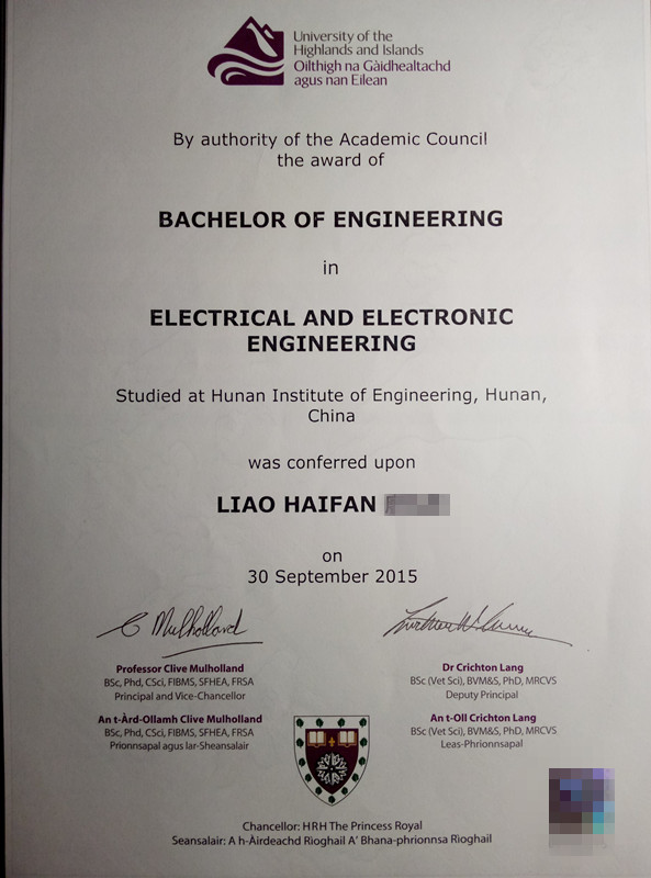 学生英语成绩达到要求,末,可注册为高地与岛屿大学海外学生。第三年修完专业课程后,学生成绩合格可获得高地与岛屿大学的电气及电子工程普通学士学位或机械工程普通学士学位。所获学位为中英两国政府及国际承认。
