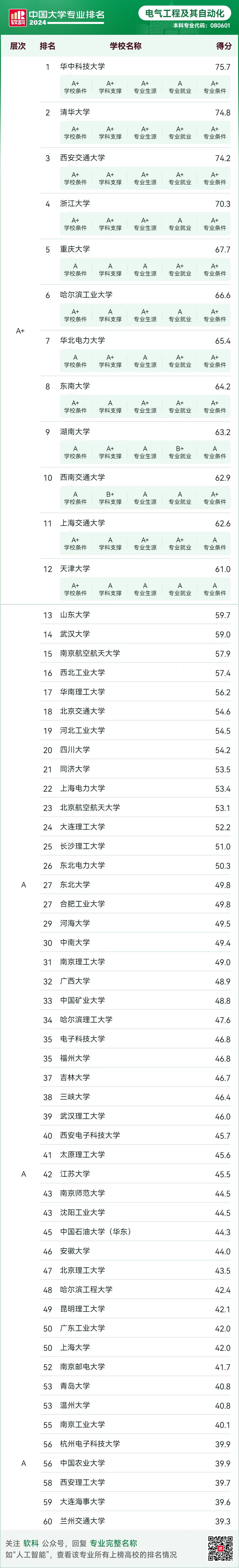 电气工程及其自动化专业排名结果如下: