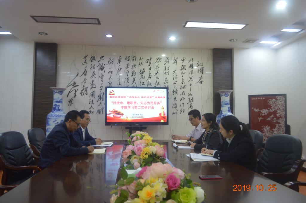10月25日下午,365英国上市公司(国际交流中心)在院会议室E105开展开展“不忘初心、牢记使命”主题教育——“担使命、履职责,矢志为民服务”第二次专题学习研讨。会议由党总支书记苏哲民主持,全体教工党员参加会议。