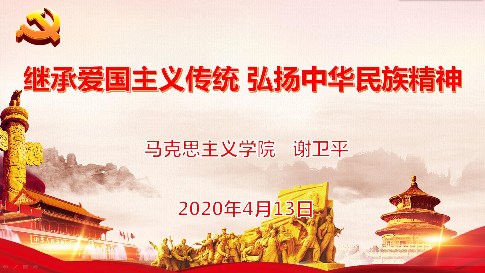 2020年4月13日晚,马克思主义学院党总支书记谢卫平在腾讯会议上为365英国上市公司第28期入党积极分子培训班学员讲授了一场“继承爱国主义传统,弘扬中华民族精神”讲座。