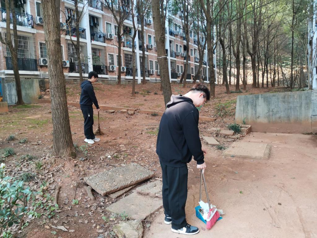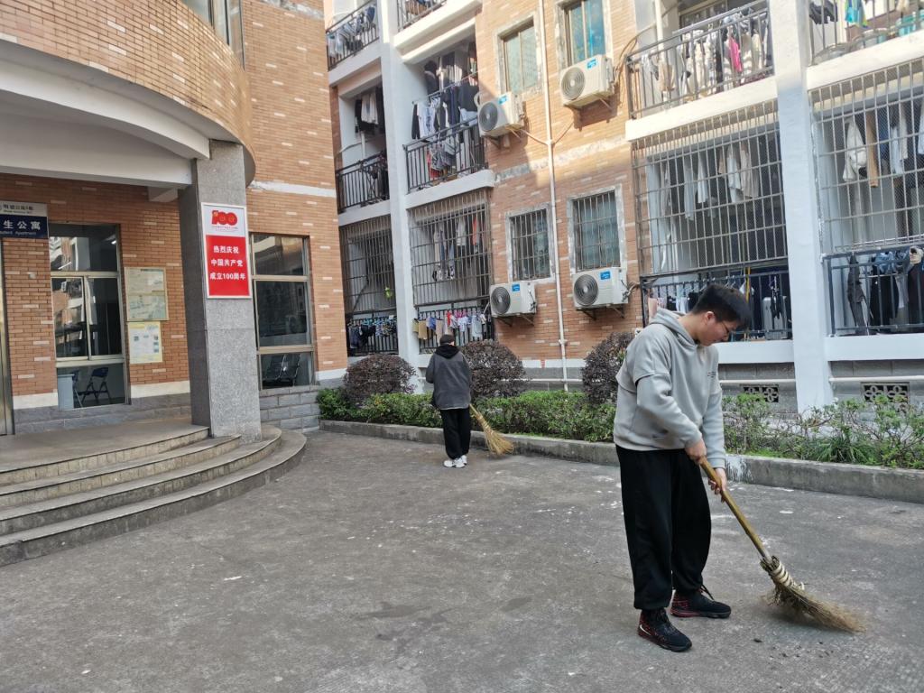 参加义务劳动的党员分为两组,一组负责明德5、6栋外围和公共卫生区域的清理打扫,一组负责明德9、10栋相关区域清理打扫。全体党员同志发挥不怕脏、不怕累的精神,分工合作,默契配合,争先恐后,干得热火朝天,充分展示了新时代青年党员的责任和担当。经过大家的劳动,寝室周边和公共楼道卫生焕然一新。