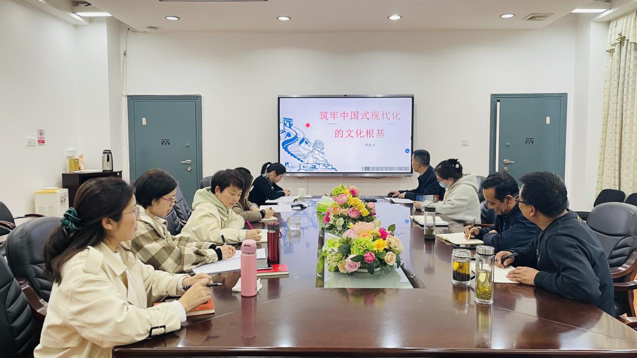随后,学院党总支书记罗胜杰带来了以《筑牢中国式现代化的文化根基》为题的党课。罗胜杰从中国特色社会主义文化的重要地位、重要指引等方面进行解读。他指出:习近平总书记在党的二十大报告中深刻阐明了文化在中国式现代化进程中的地位作用,明确了“推进文化自信自强,铸就社会主义文化新辉煌”的重大任务。高校肩负着国际交流与合作、文化传承与创新的重要使命,我院更应首当其冲,坚持重视培养学生坚守文化自信,守正创新,讲好中国故事,传播好中国声音。
