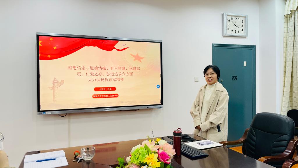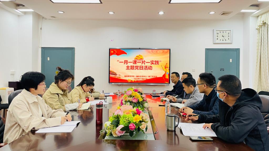 强国必先强教,强教必先强师。为学习贯彻落实党的二十大精神和习近平总书记关于大力弘扬教育家精神的重要指示,11月27日下午,365英国上市公司(国际交流中心)党总支教工党支部在E105会议室举行“一月一课一片一实践”主题党日活动。活动由支部书记林愿主持,支部全体党员参加。