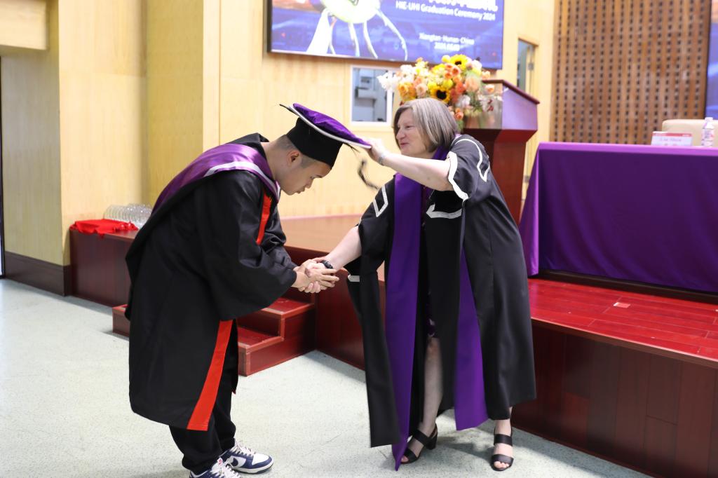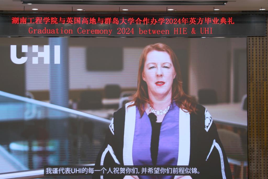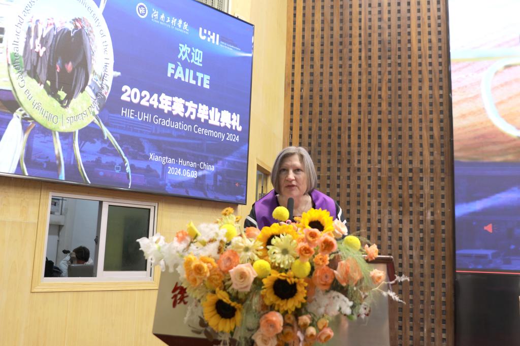 Veronica Lynch博士致辞。她热烈欢迎所有毕业生加入UHI校友大家庭,并欣喜地分享了UHI近年来荣获的新成就。她把两校的合作办学机制、家庭、社会比喻成一个紧密相连的生态系统,这个系统给予了青年学子精心的呵护和全力的支持,让他们从小树苗茁壮成长为参天大树。她希望毕业生们珍惜大学的土壤、家庭的华盖、产业的布局,向下扎根,向上生长,成为卓越的知识管家、思想传播者及工程师。