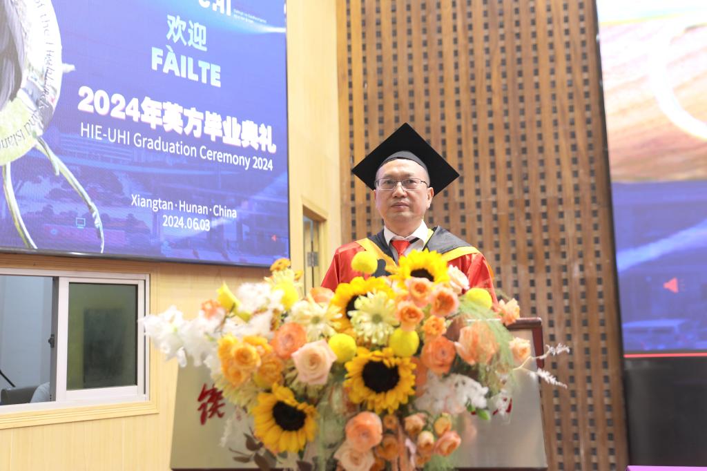 “你们以昂扬向上的精神风貌,书写了中英合作办学的华丽篇章,向学校、社会与家庭交出了一份满意的答卷。”校长易兵向毕业生表示祝贺。他号召青年学子与时代同步伐、与人民共命运,把激昂的青春梦融入伟大的“中国梦”。同时,积极发挥国际化教育的资源优势,在实现“中国梦”和构建“人类命运共同体”的伟大实践中,勇立时代潮头,创造人生辉煌。