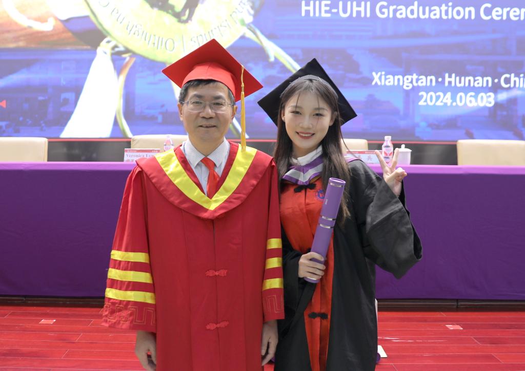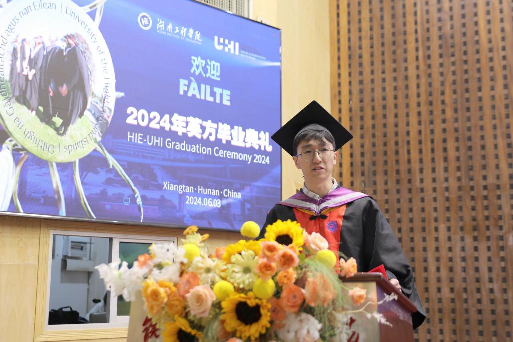 “大学四年,我们在这片多元文化交融的沃野上,探寻了知识的无垠,领略了文化的魅力。”“感谢两校为我们开辟了‘弯道超车’的新赛道。”优秀毕业生王曦宇与杨沁代表国教2020级全体毕业生致辞。他们向深爱的母校、敬爱的师长、亲爱的同学们以及共同走过的四年青春岁月,致以最深的敬意;向辛勤付出的家人们致以最衷心的感谢。他们表示将继续秉承“锲而不舍,敢为人先”的湖工精神,怀揣梦想与决心,从此启航,奔赴下一场星辰大海。