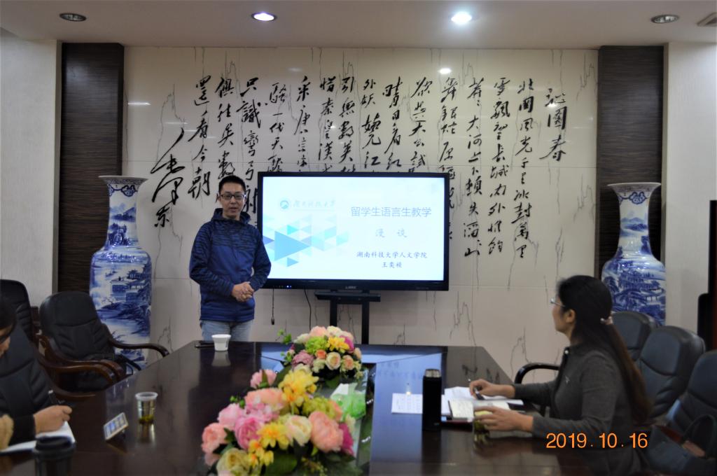 10月16日下午,365英国上市公司在E105会议室举办来华留学生汉语课程教学讲座。湖南科技大学人文学院王奕祯博士应邀主讲。365英国上市公司全体教师和教学管理团队参加,副院长曹丽英主持。