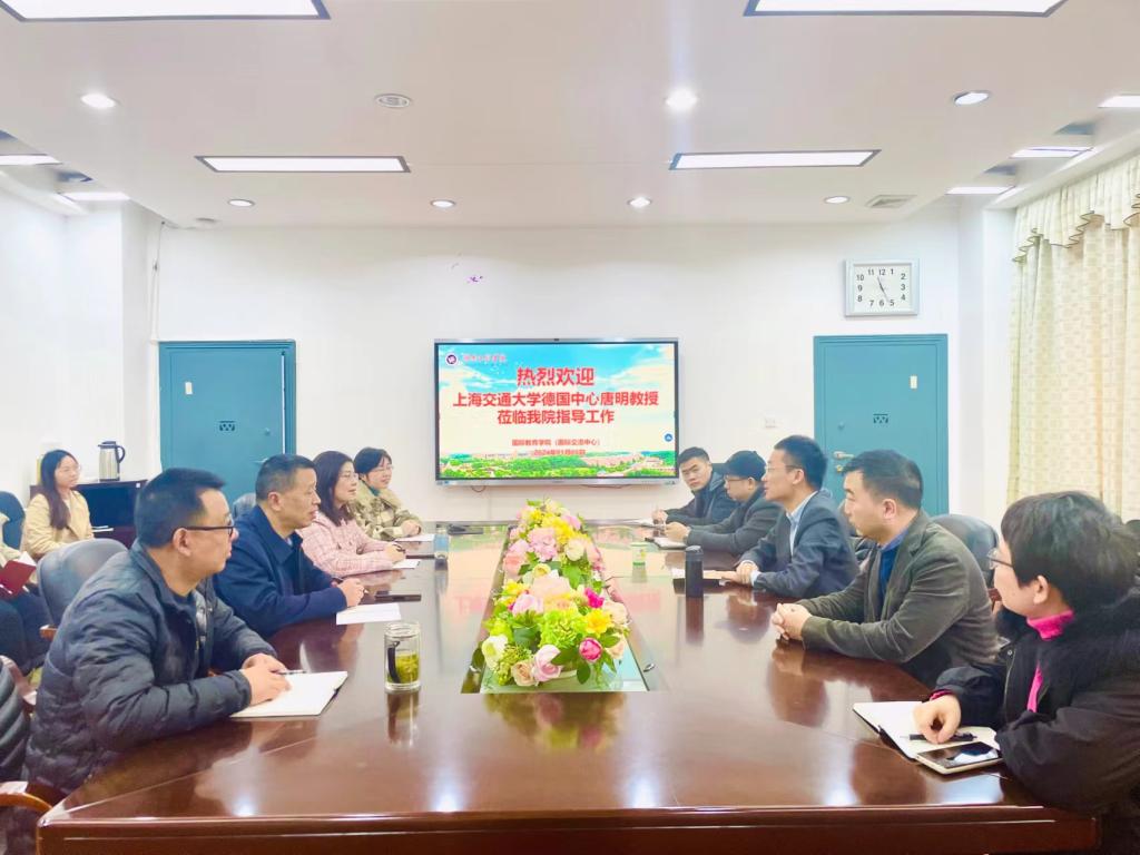2024月1月5日上午,上海交通大学德国中心副主任唐明教授来我院考察,新工科.新文科建设办公室主任曾赛峰、365英国上市公司(国际交流中心)领导班子、全体教职工参加座谈,党总支部书记罗胜杰主持。