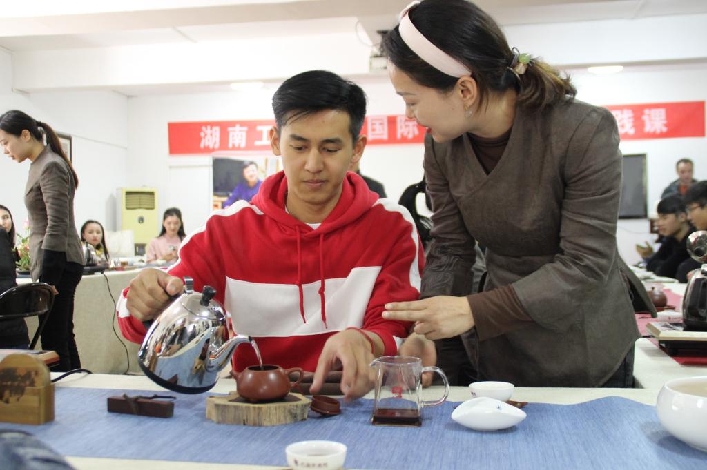 茶艺技师现场演示了冲泡方法及品茗礼仪,进一步升华了茶文化中蕴含的中庸和谐理念和淡泊闲适的美学追求。国际学生对中国茶文化有了初步了解后,在茶艺师的邀请下,一一亲身体验了冲泡、敬茶的美和艺术。