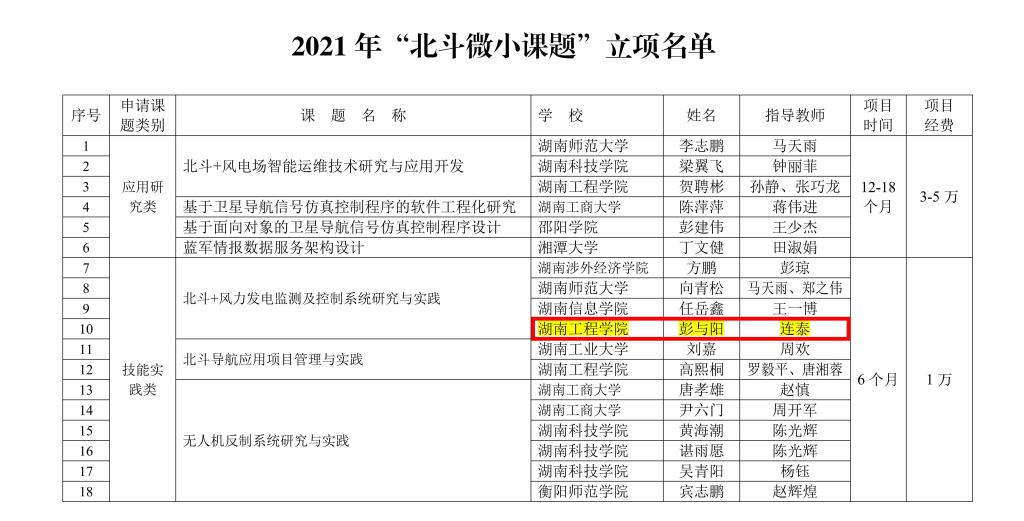 近日,湖南省教育厅公布2021年“北斗微小课题”立项名单,学校6名研究生和1名本科生获得该项目立项资格。我院党总支副书记连泰指导、电气1861班学生彭与阳主持的课题《北斗-风力发电监测及控制系统研究与实践》,成为学校唯一由本科生申报成功的项目,获该项目技能实践类课题立项资格。